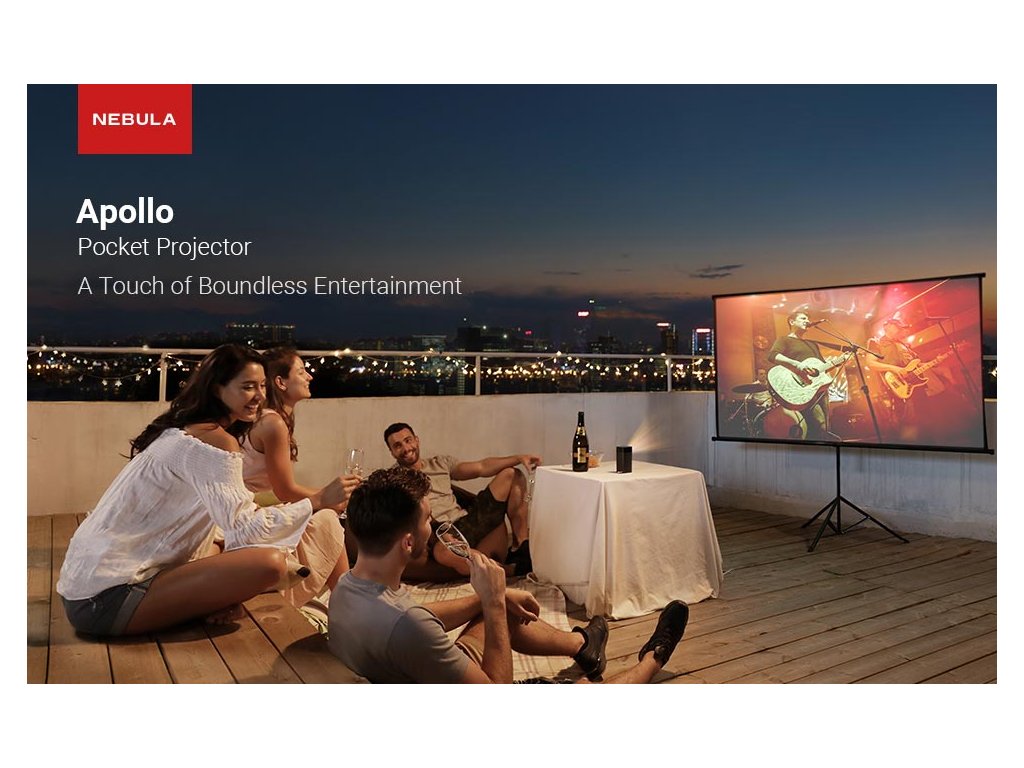 Nebula Apollo je přenosný bezdrátový projektor značky Anker, který se vyznačuje minimálními rozměry a váhou 471 gramů a výkonným akumulátorem, který dokáže na jedno nabití zajistit energii až na 4 hodiny provozu. Přístroj je možné ovládat pomocí Touchpadu, který je umístěn na horní straně, dálkovým ovladačem dodávaným společně s projektorem nebo mobilním telefonem prostřednictvím aplikace Nebula Connect. Široká konektivita umožňuje přehrávání audia a videa z různých zdrojů. Projektor je vybaven automatickou korekcí lichoběžníkového zkreslení obrazu a integrovaným závitem pro upevnění na stativ. Zařízení lze také zavěsit horní stranou dolů, přičemž obraz je podle potřeby možné otočit o 180 °, případně zrcadlově obrátit. |