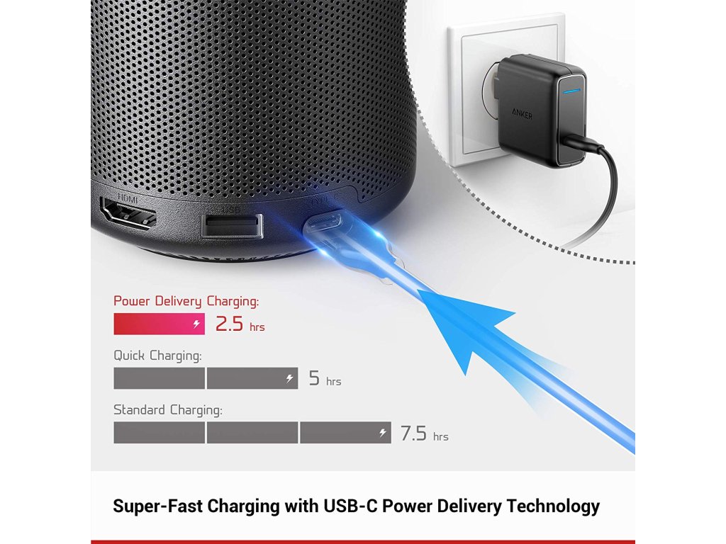 Super-rychlé nabíjení Port USB-C na Capsule II s technologií Power Delivery umožňuje rychlé nabíjení. Sledujte film a současně nabíjejte projektor přiloženou nabíječkou Anker. |